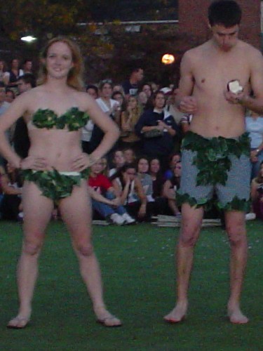 Adam and Eve costume, worn just days before the naked suit. I wore this costume in front of the entire Greek community and we won the costume contest. Look closely at Adam's face, and you can tell he just found the worm in his apple. No, really, there was a worm.